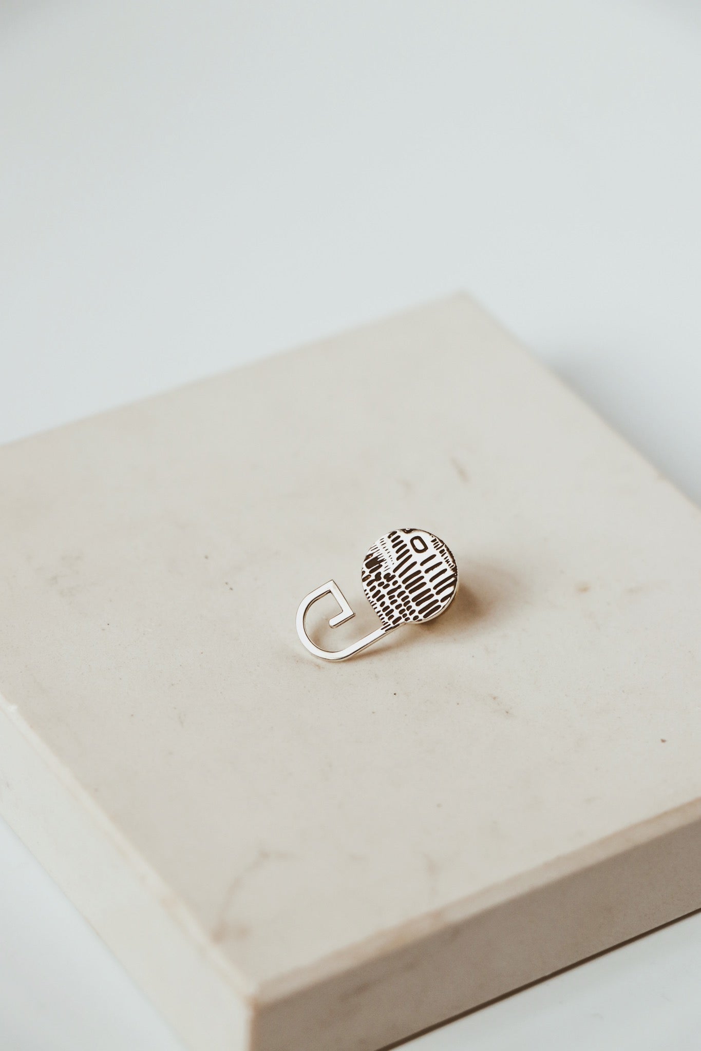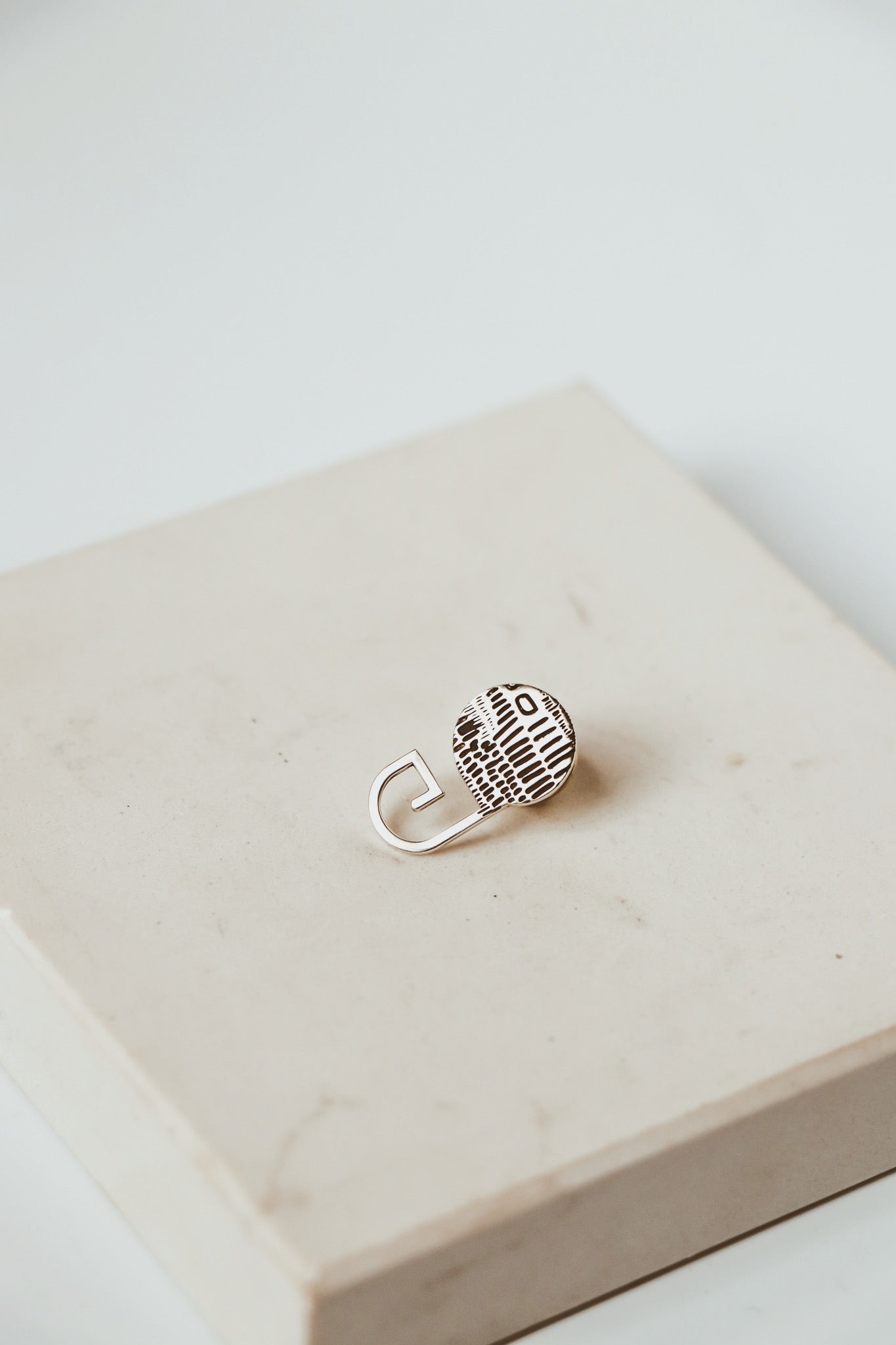 The Blazer Pin 100 is our most versatile piece in the range thus far. This pin can be worn as an accessory all by itself and can be used as a support piece for various other dida pieces to hook onto to create uniquely assembled wearable art. The circular profile of the pin is beautifully detailed with the dida texture as a playful finish. The inclusion of the Es Connector profile allows for the interplay with the dida pieces.