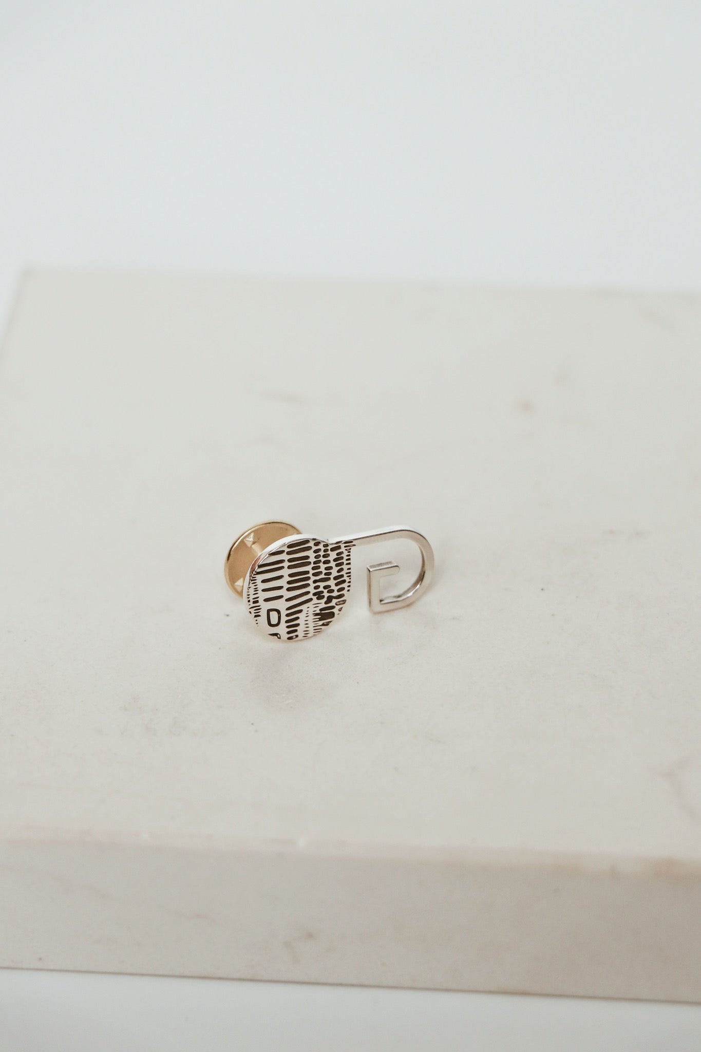 This piece is complete with a pin and a discrete o-ring on the back to allow for utmost flexibility in use. The Blazer Pin is made from high quality brass and is available in silver and gold on request.