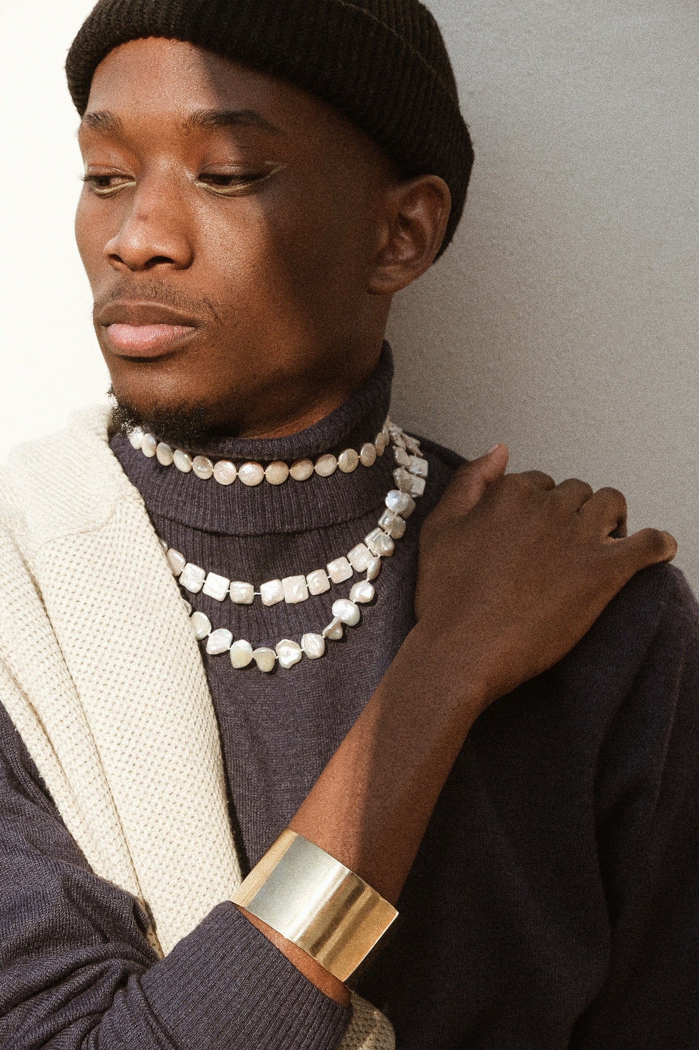 The Linear Pearl Arrangements aim to prompt your most creative juices. In application, the Linear Pearls can be coupled with the Archtype for a feature around your neck, the string of pearls can be wrapped around your wrist as a bangle, around your neck as a choker and used on the lapels of a suit or a blazer ensemble instead of a chain. We invite you to be as imaginative with these pieces as possible.